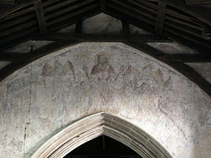 The nave roof is a fine one, with alternating tie and hammer beams. The latter are carved with angels carrying scrolls, shields and things. You might be forgiven for missing them at first, though, for the first thing that catches your eye when you look up is the amazing doom painting over the chancel arch. It is quite extraordinary, and has, apart from the bottom left hand corner, survived remarkably well - the colours are faded, of course, but it was still easy to make out most of the action.